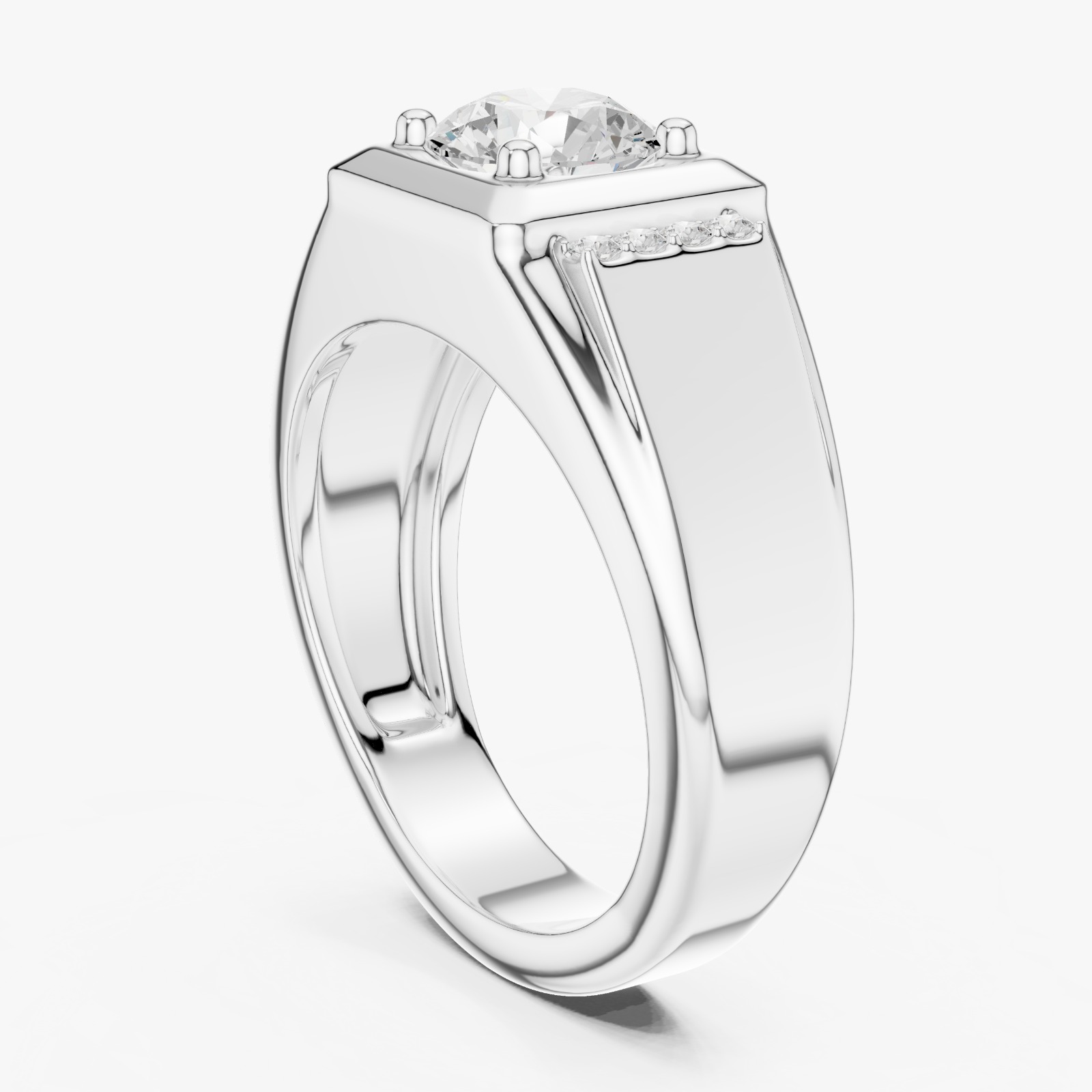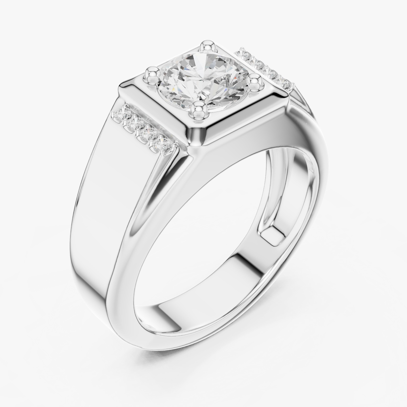 Make a bold statement of strength and sophistication with the Royal Crest Diamond Men’s Ring. Designed for modern elegance, this ring features a striking round brilliant-cut center diamond, securely set in a bold square frame. Accented by diamond-studded shoulders, the design delivers brilliance from every angle while maintaining a strong, masculine profile.